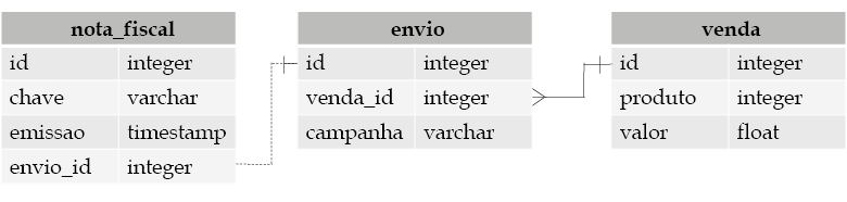 Todas as tabelas possuem um identificador único, listado como “id”. A tabela “envio” se relaciona tanto com a tabela “venda”, por meio do atributo “venda_id”, quanto com a tabela “nota_fiscal”, por meio do atributo “envio_id”, sendo possível, assim, a ligação entre a venda e as notas fiscais de remessa, fato gerador da receita.