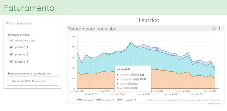 O gráfico da figura 2 é um gráfico de área, que exibe o valor dos produtos de maneira empilhada (acumulada). Ele é atualizado no primeiro dia do mês seguinte com os dados do mês anterior por meio de uma consulta SQL.