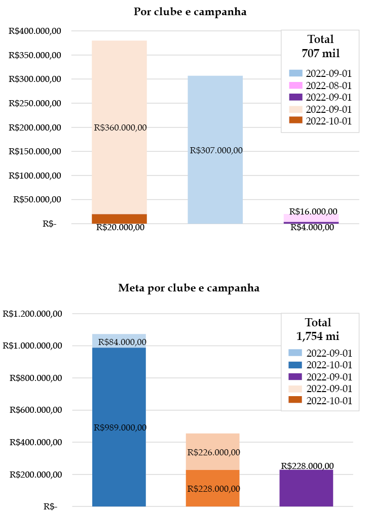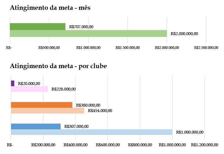 Os gráficos da figura 4 são complementares aos gráficos da figura 3, realizando uma ampliação da visualização do atingimento da meta estipulada. Os dados para a construção desta visualização se originam da mesma consulta SQL que é utilizada para a visualização da figura 3, porém com filtros diferentes, aplicados diretamente no Data Studio. Destaca-se que as visualizações se mostraram importantes para o acompanhamento do desempenho da empresa estudada, de forma a proporcionar um entendimento mais rápido e visual dos resultados e permitir um maior planejamento futuro.